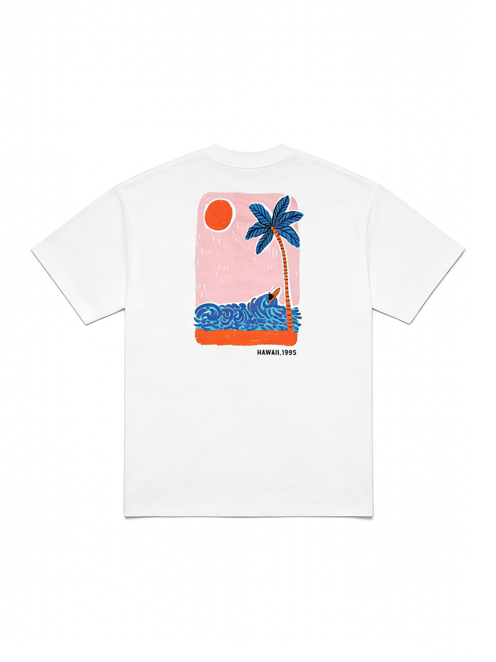 Oversized Beige Cotton T-Shirt - Hawaii Surfing Vibes Graphic Print Casual Coastal Style Top