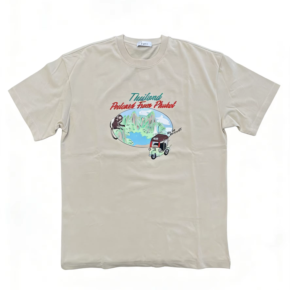 Oversized Beige Cotton T-Shirt - Thailand Phuket Cartoon Graphic Print Casual Streetwear Top
