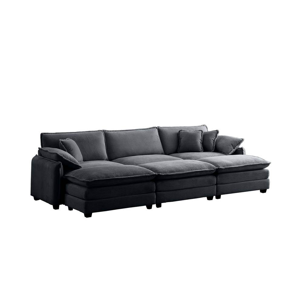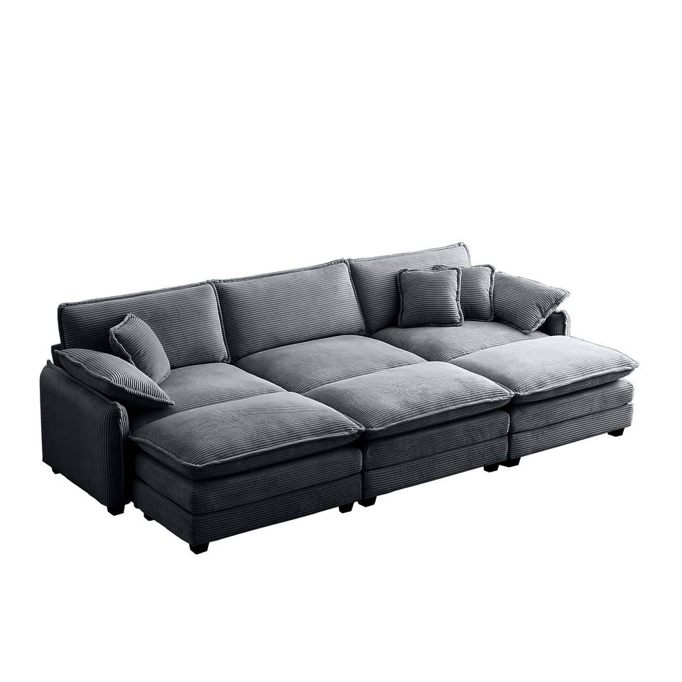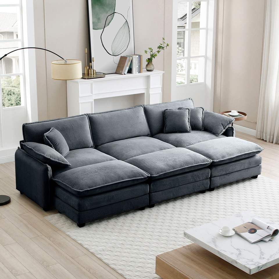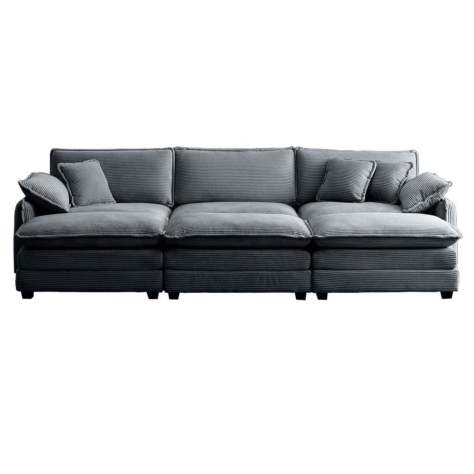 Divano Letto Modulare Oversize in Corduroy Grigio con 3 Pouf, Funzioni Lavoro e Riposo, 3 Poggiapiedi, 3 Posti