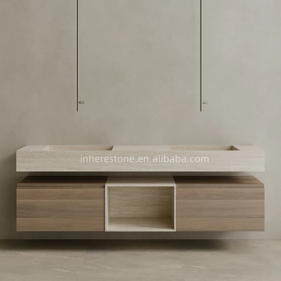Oversized Roman Travertine Floating Double Sink Vanity Wall Mounted Stone Bathroom Cabinet with Wood Drawers