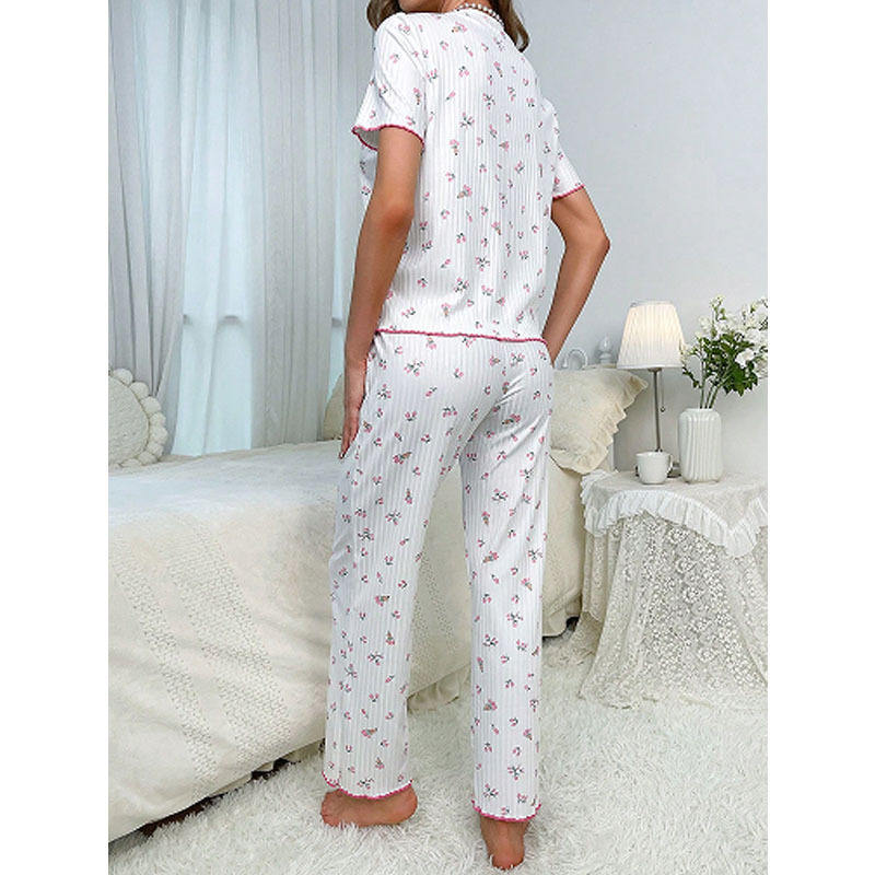 P031 Trend Women's Casual Lounge Wear Set short Sleeve Girls Pajamas with Lace Tirm Summer Autumn Embroidered Printed Lingerie