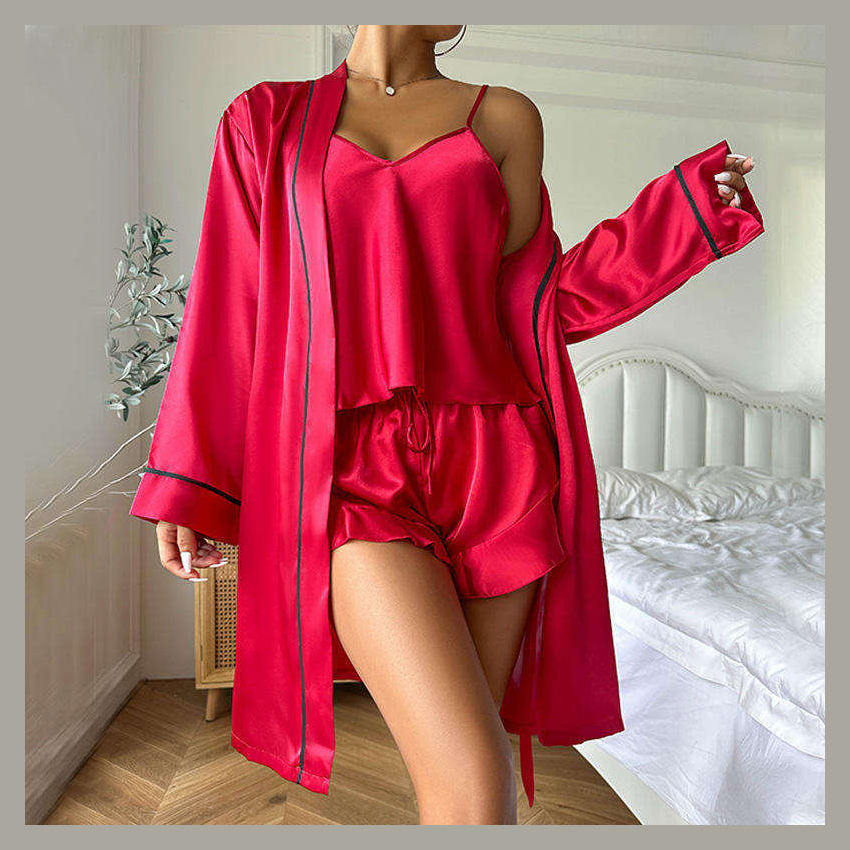 P177 New Summer Ice Silk Sexy Suspender Shorts Three Piece Set Pajamas Night Wear for Women