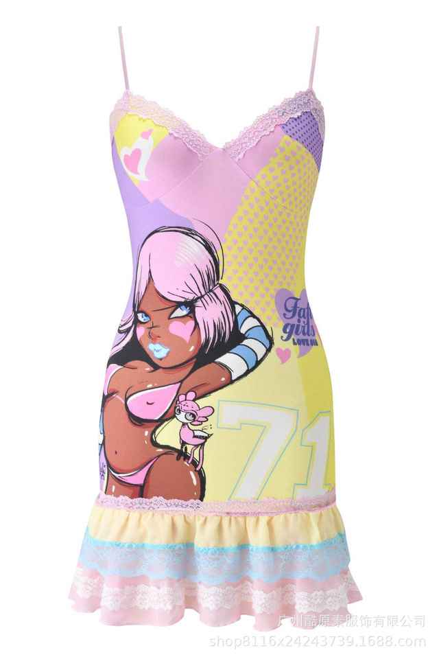 PEEQI 2565 New Summer Fashion Women Sexy Dresses Cartoon Printed Slimming Dress Lace Patchwork Pleated Mini Dresses for Women