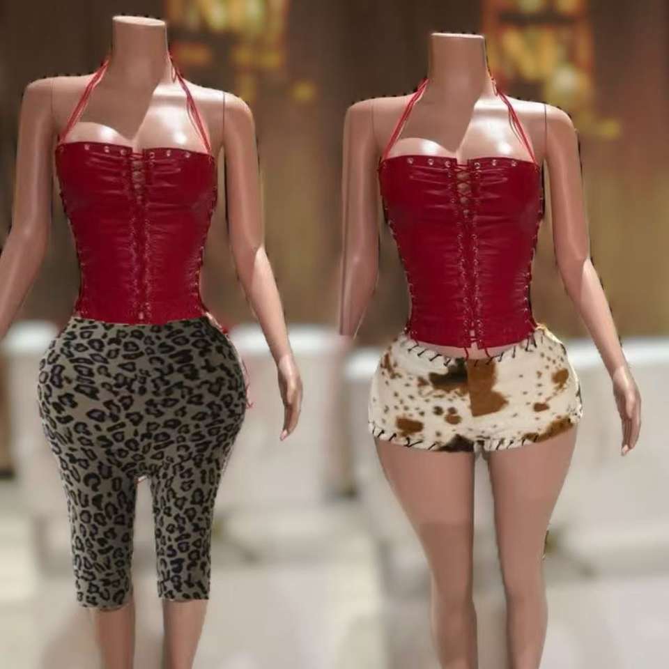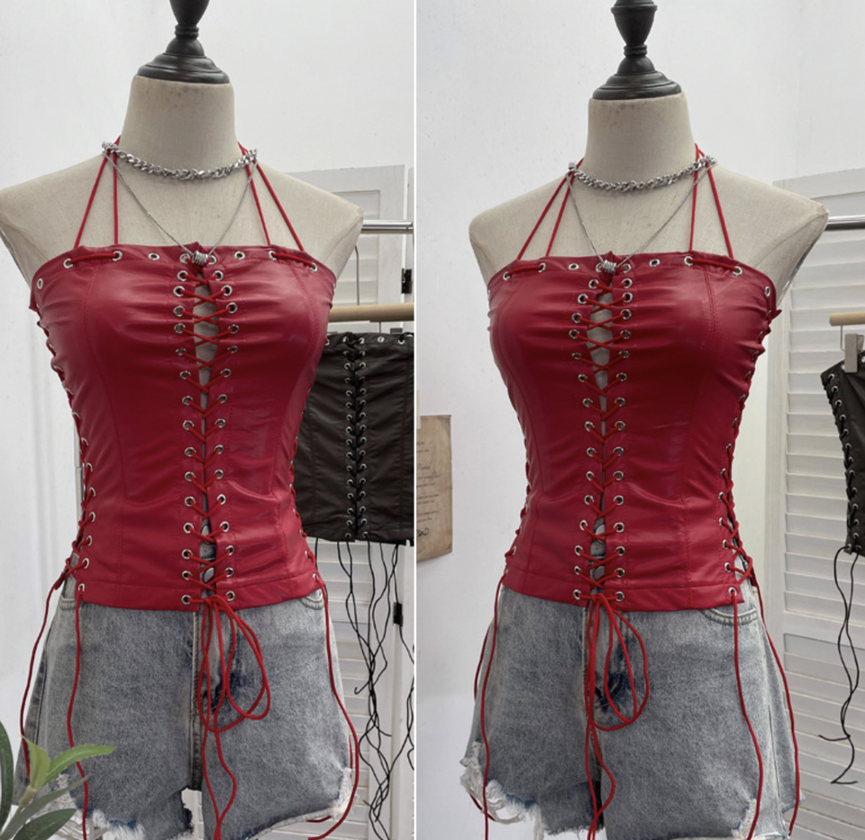 PEEQI Fashion Women Outfits Bandage Sleeveless Backless Pu Leather Crop Top Shorts / Skirt 2 Piece Set Sexy Y2K Streetwear Women