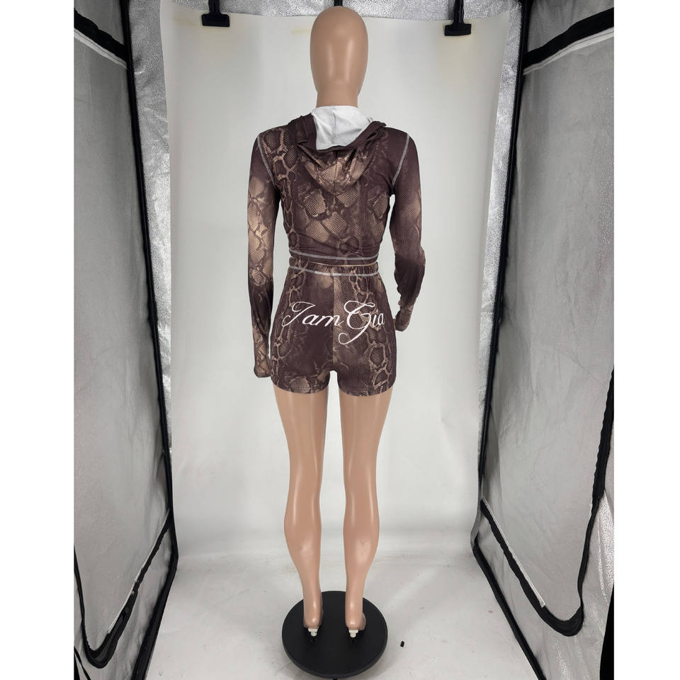 PEEQI HR26011 Completo Primaverile da Donna Due Pezzi, Top con Cappuccio a Maniche Corte con Stampa Leopardata a Righe e Pantaloncini, Outfit Sexy da Donna