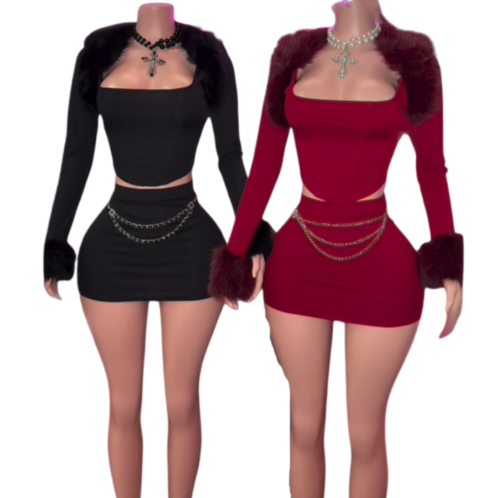 PEEQI K25S85367 New Arrivals Women's Outfits Fur Patchwork Crop Skirt 2 Piece Set Sexy Club Skirts Two Women Clothing 2026