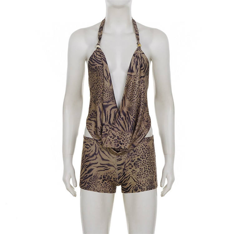 PEEQI MR44587 New Sexy Leopard Print Hanging Neck Backlesstop Shorts Suit Women 2 Piece Set