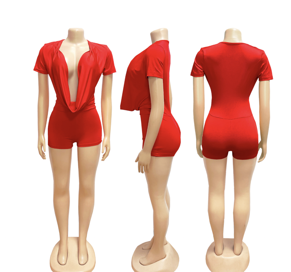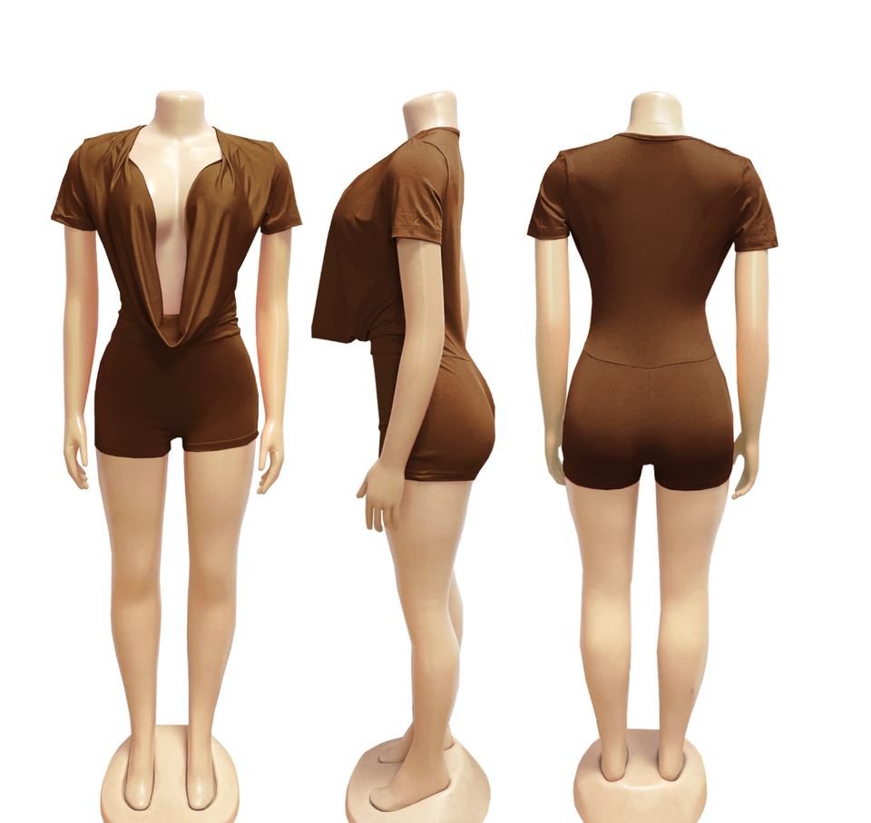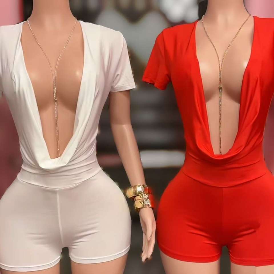 PEEQI TW829 Nuova Collezione Primavera, Tuta Intera Aderente con Scollo Profondo a V e Arricciature, Maniche Corte, Sexy Tuta Intera Monocolore