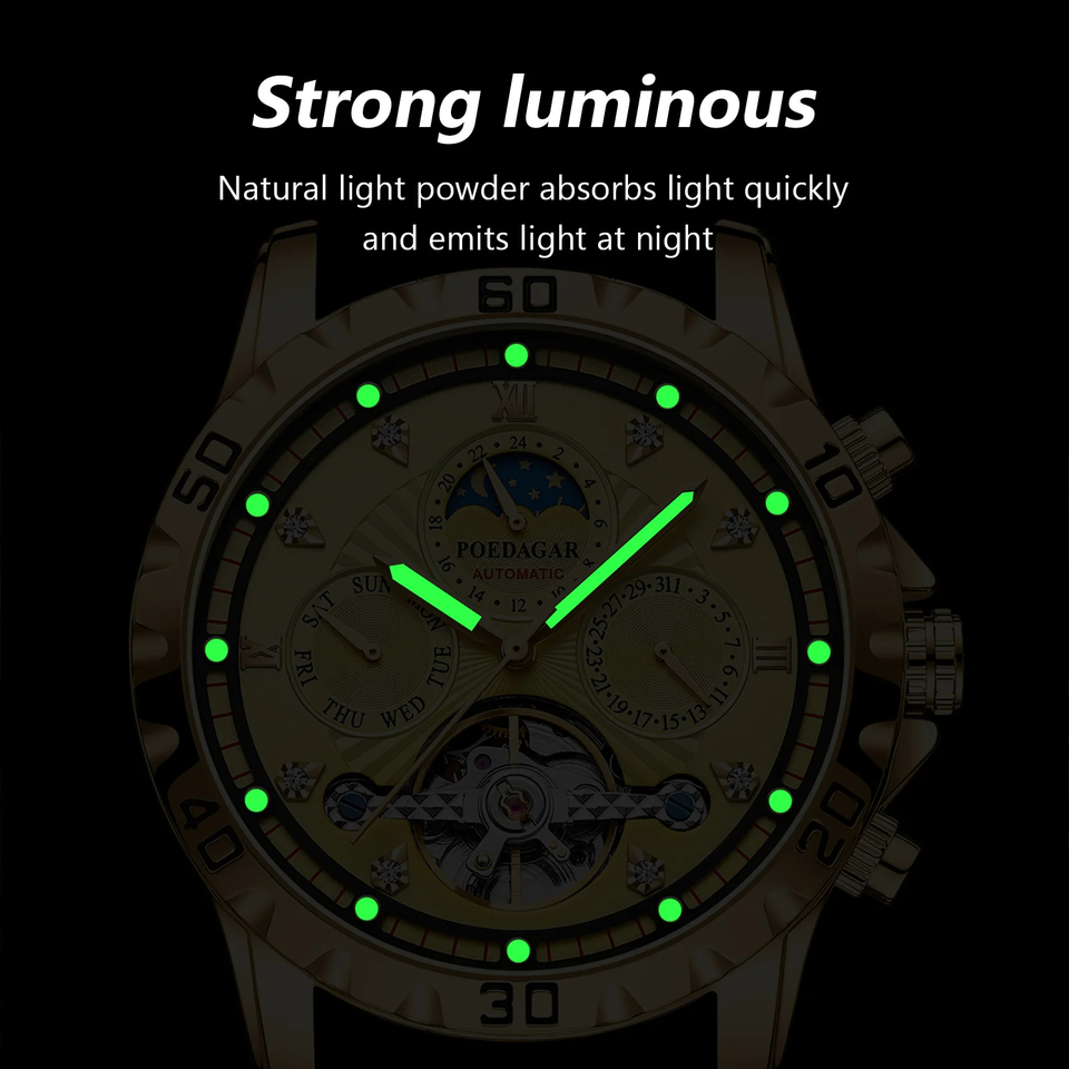 POEDAGAR Orologio meccanico automatico da uomo 43 mm, cassa in lega, cinturino acciaio inox 22 mm/20 cm, vetro Hardlex, luminescente, resistente 3 bar