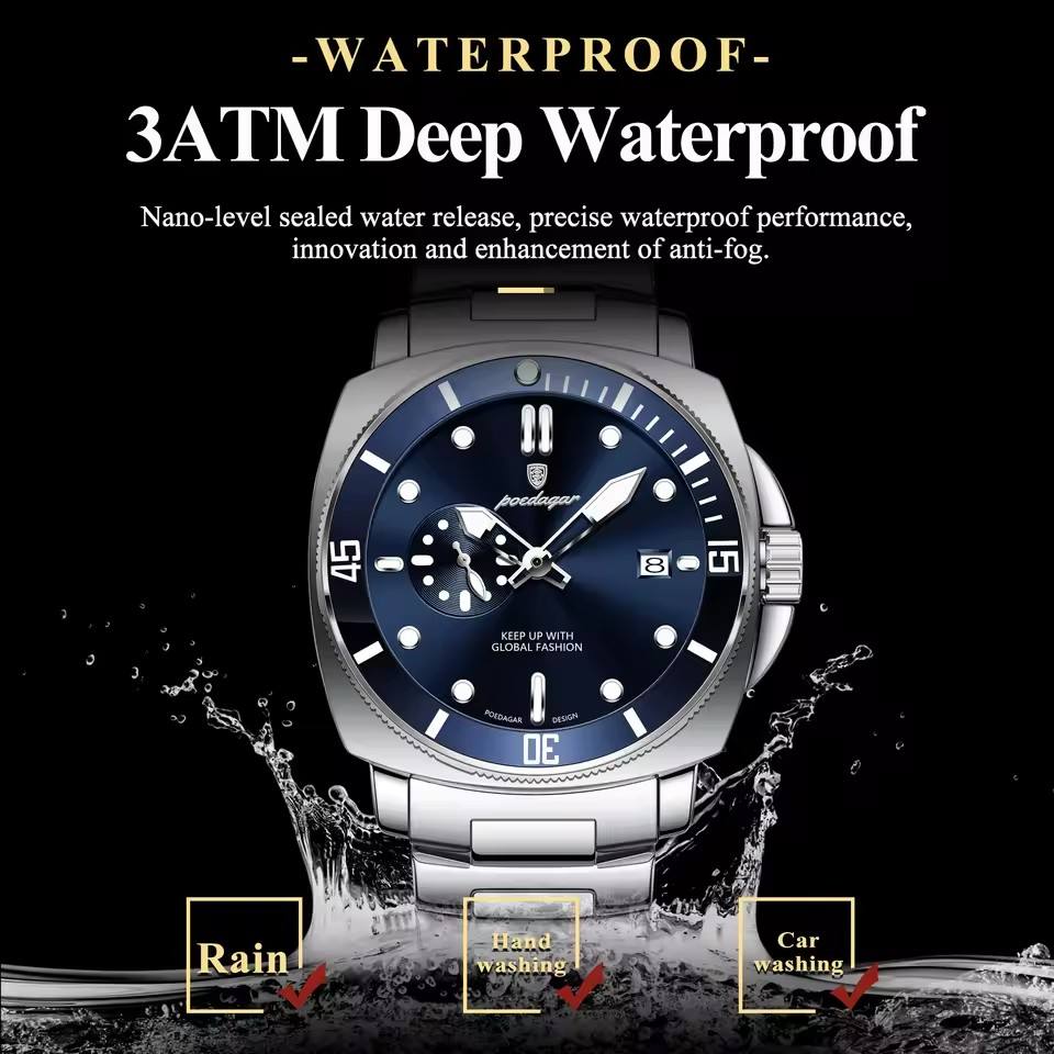 Orologio da uomo POEDAGAR di alta moda, impermeabile, luminoso, con calendario, in acciaio inossidabile, al quarzo, da polso, per affari.