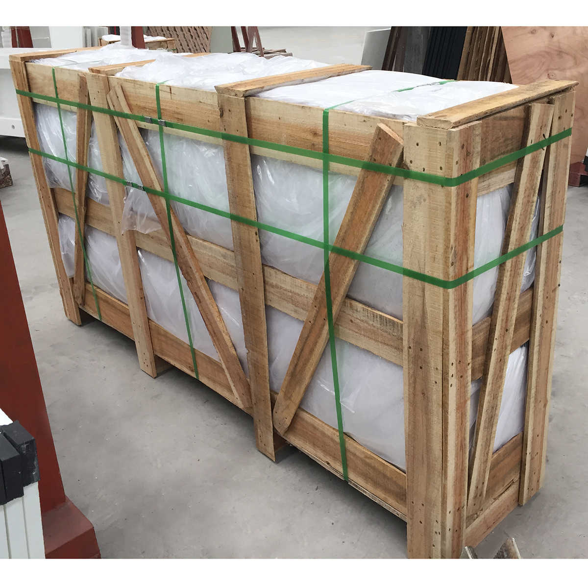Controsoffitti: imbottito con plastica espansa e imballato in casse di legno fumigate, rinforzato con cinghie di metallo all'esterno.