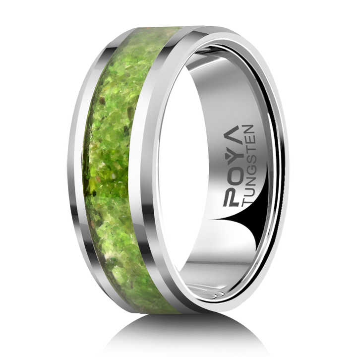 Anelli Nuziali POYA 8mm in Argento per Fidanzamento e Anniversario, Anello in Tungsteno Smussato con Intarsio di Olivina, Vestibilità Confortevole