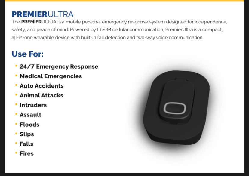 PREMIERULTRA Ultra-Light Ultra-Discreet Design Two-Way Voice Communication Automatic Fall Detection 24/7 Rapid Response