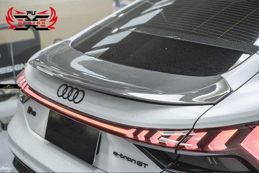 Kit Carrozzeria Stile F in Fibra di Carbonio Secca per Audi E-TRON GT: Paraurti, Labbro Anteriore, Prese d'Aria Anteriori, Minigonne Laterali, Diffusore Posteriore, Alettone