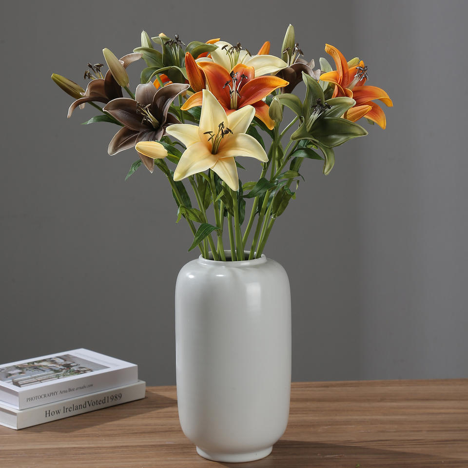 PU Lily Fall Flowers Artificial in Vase Real Touch Orange Autumn Silk Faux Flowers Arrangements Lily Centerpiece Decor for Home