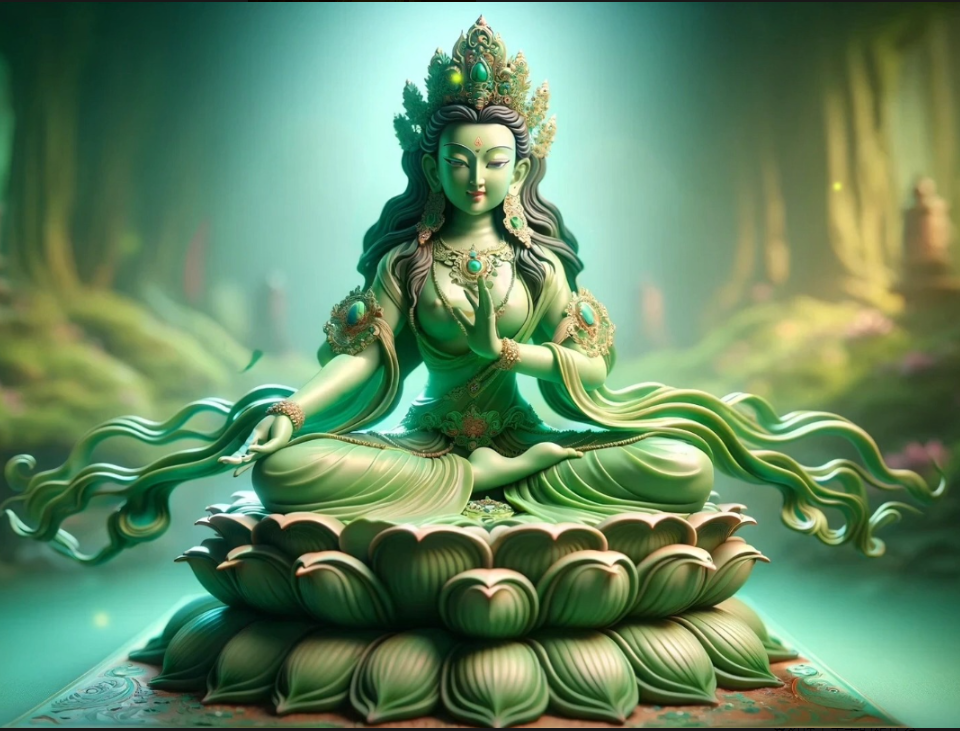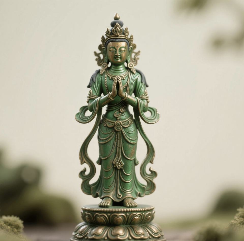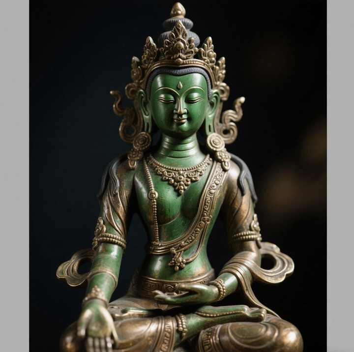 Statua e Scultura in Rame Dipinto della Divinità Femminile Guardiana nelle Statue Buddiste Indiane - Tara Verde