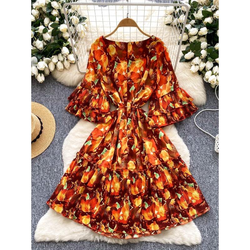 Palace Style Printed Dresses Women Summer Ruffled Sleeves Straps Waistband Patchwork Featuring Niche Vintage Vestidos