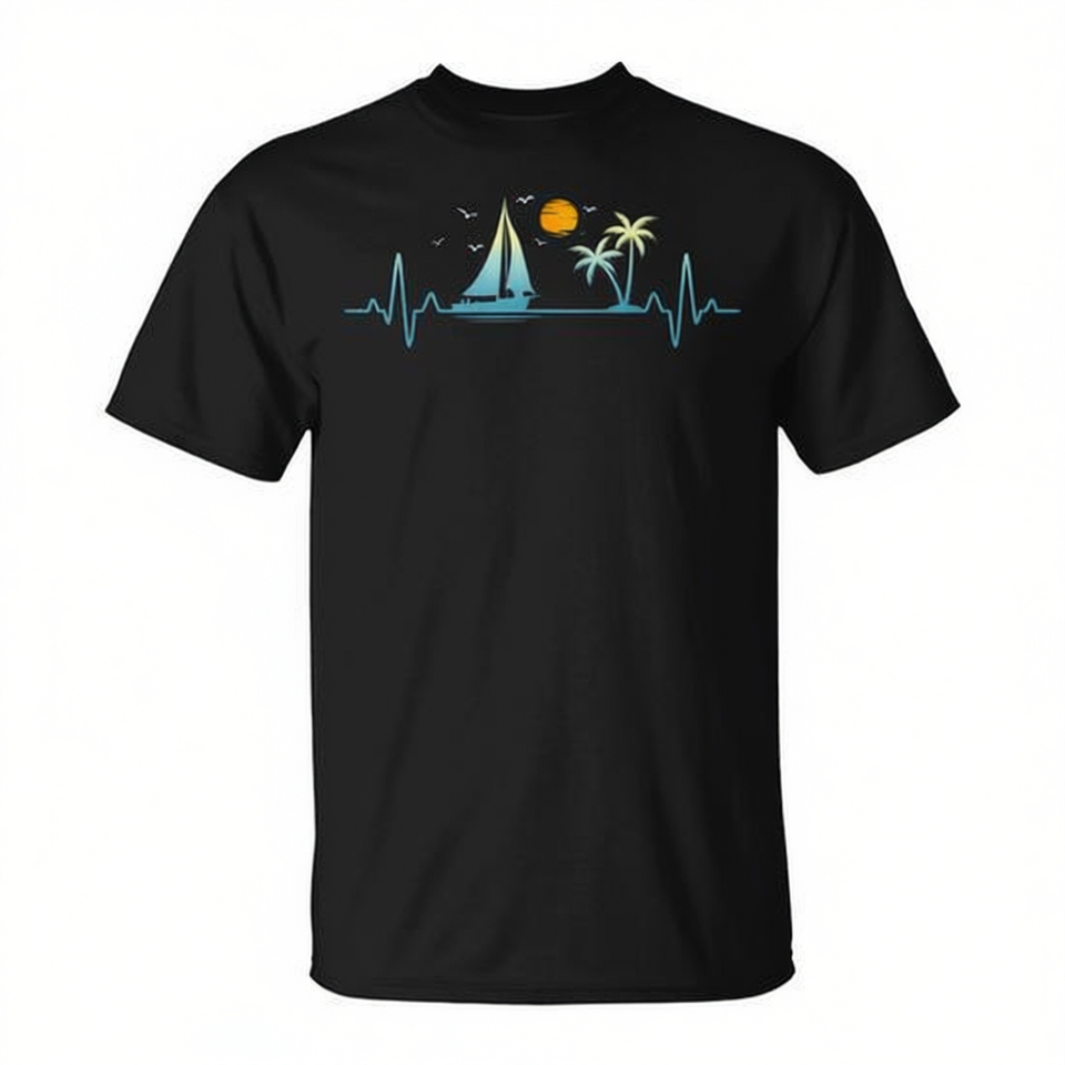 T-shirt estiva con palma, battito cardiaco, spiaggia tropicale e tramonto