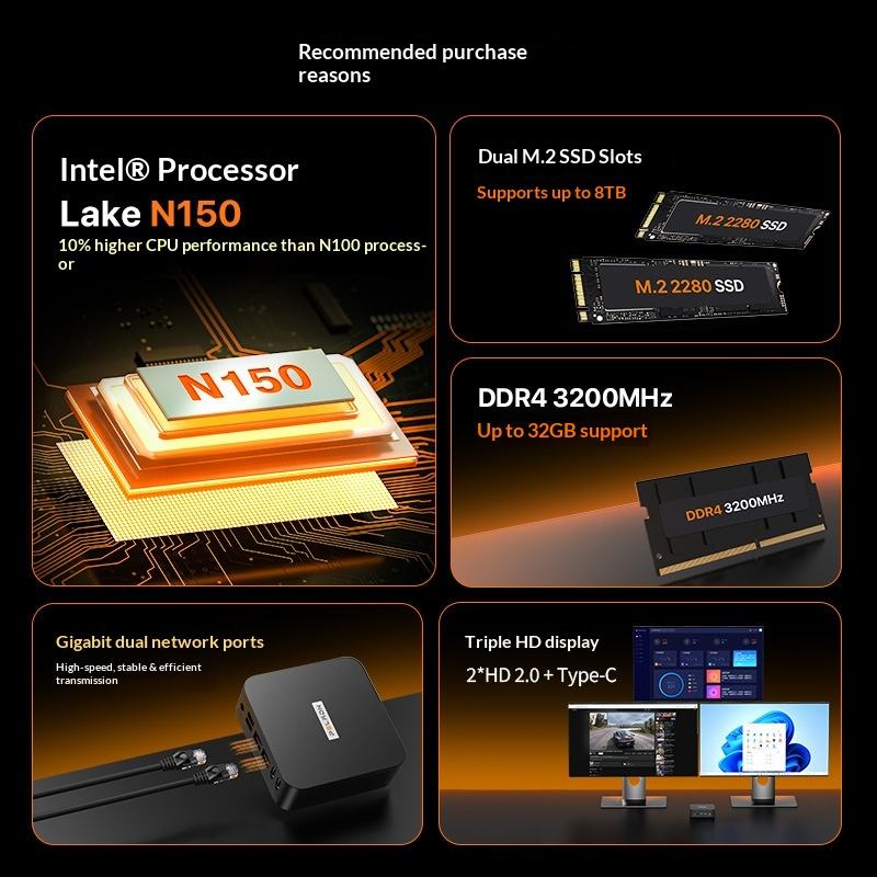 Mini PC Desktop Panlei N150 con Doppia Porta di Rete, Processore Pentium/Celeron, Garanzia Triennale, Grafica Integrata, Senza Tastiera/Mouse per Casa