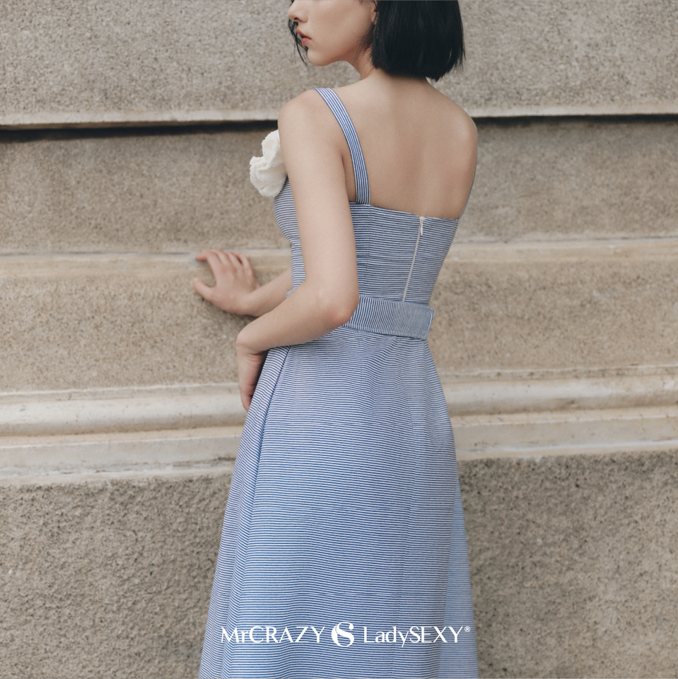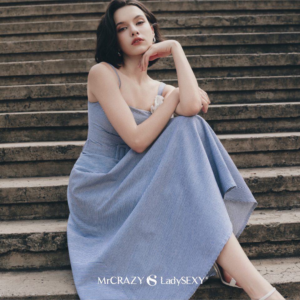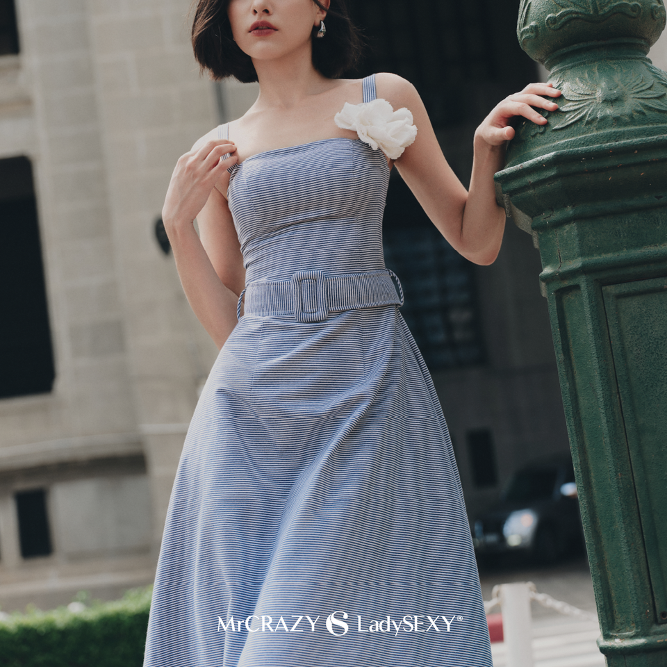 Parisian dress in light blue soft denim features a midi length for a modern chic urbanist collection by Vietnam local brand