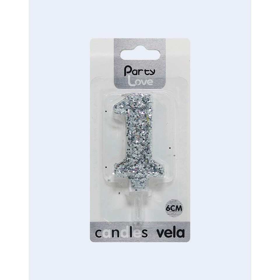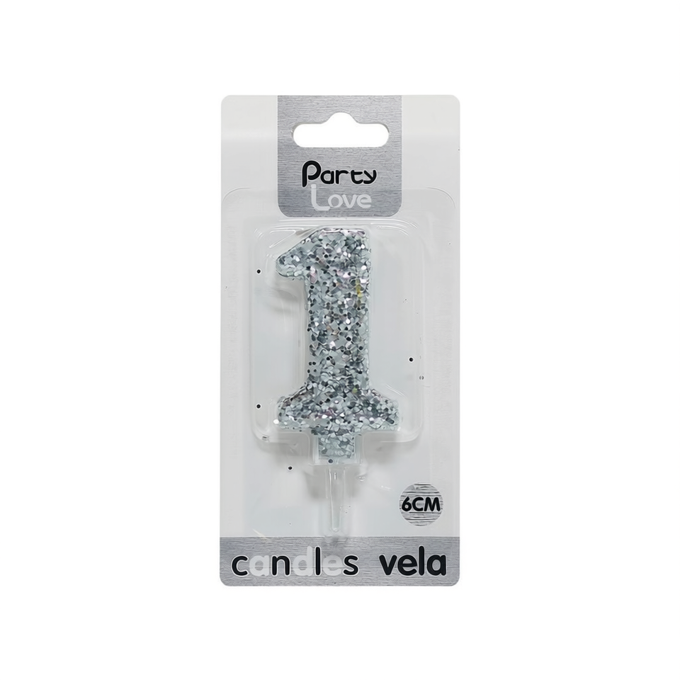 Candela Decorativa Numero 1 in Glitter Argento 6Cm per Torte di Compleanno