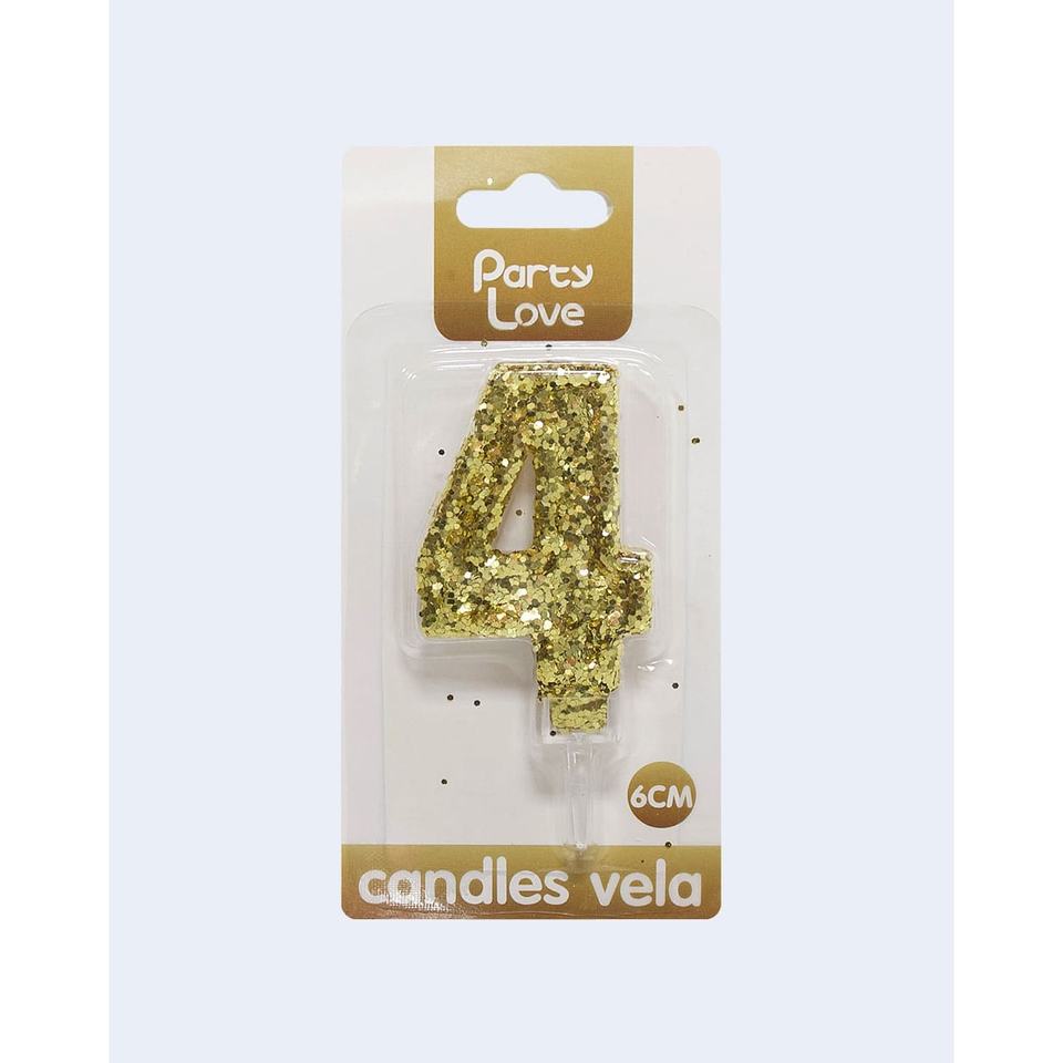 Candela d'Amore per Feste Numero 4 con Glitter Dorato 6Cm Candele per Compleanno