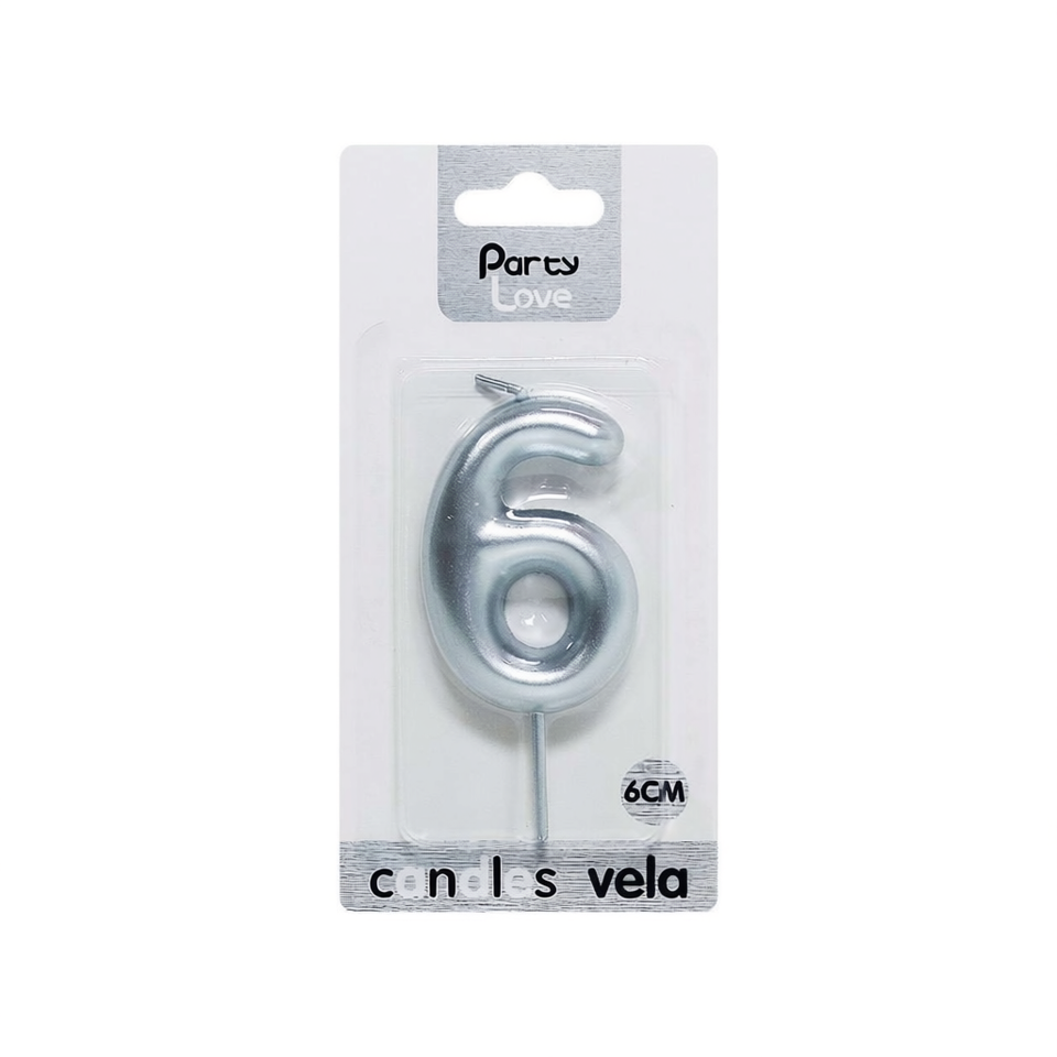 Candela Numero 6 in Argento per Feste, 6 Cm, Decorazione per Torte di Compleanno