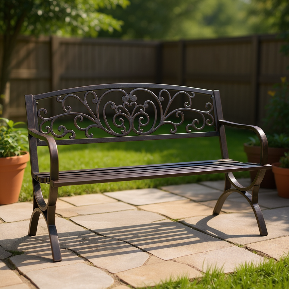 Panca da Giardino 50 Pollici con Schienale a Farfalla, Struttura in Ferro Finitura Bronzo, Arredo Tradizionale da Esterno Resistente all'Acqua per Giardino o Hotel