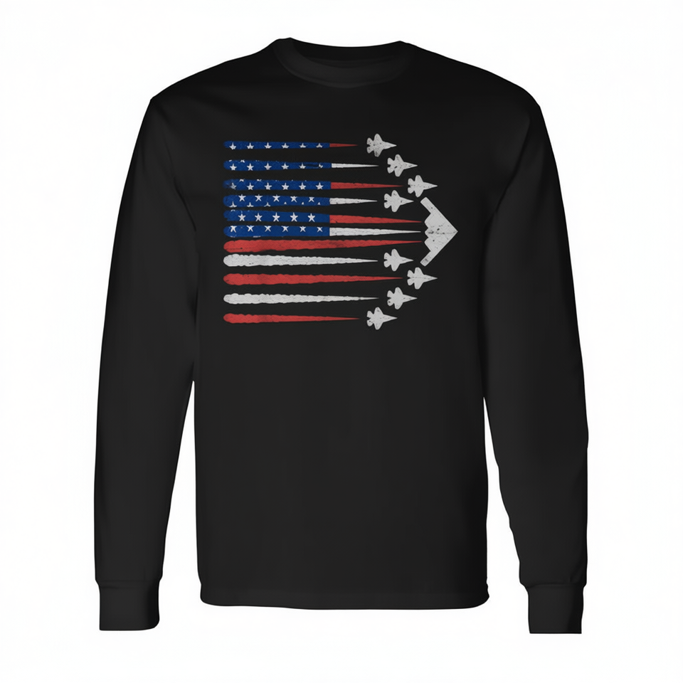 T-Shirt a Maniche Lunghe con Bandiera USA e Aerei da Combattimento, Unisex per Adulti, Stampa Digitale Promozionale