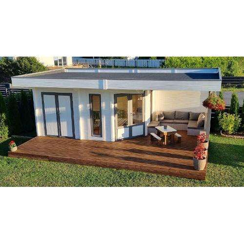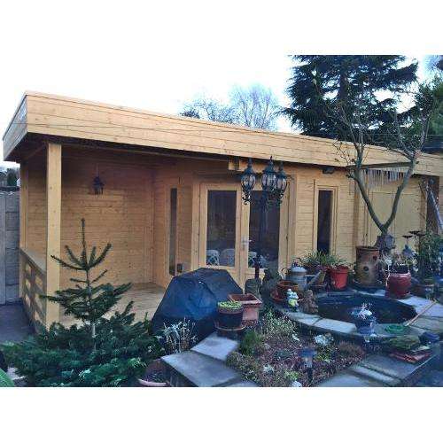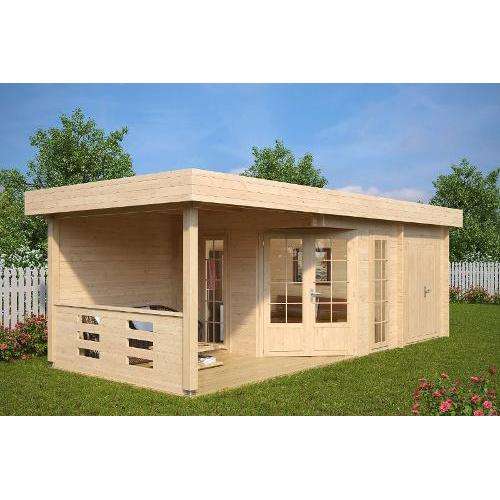 CASA DA GIARDINO DESIGN CON TETTO PIANO E TETTOIA “JACOB E” 12M² 44MM - Grandi chalet da giardino in legno