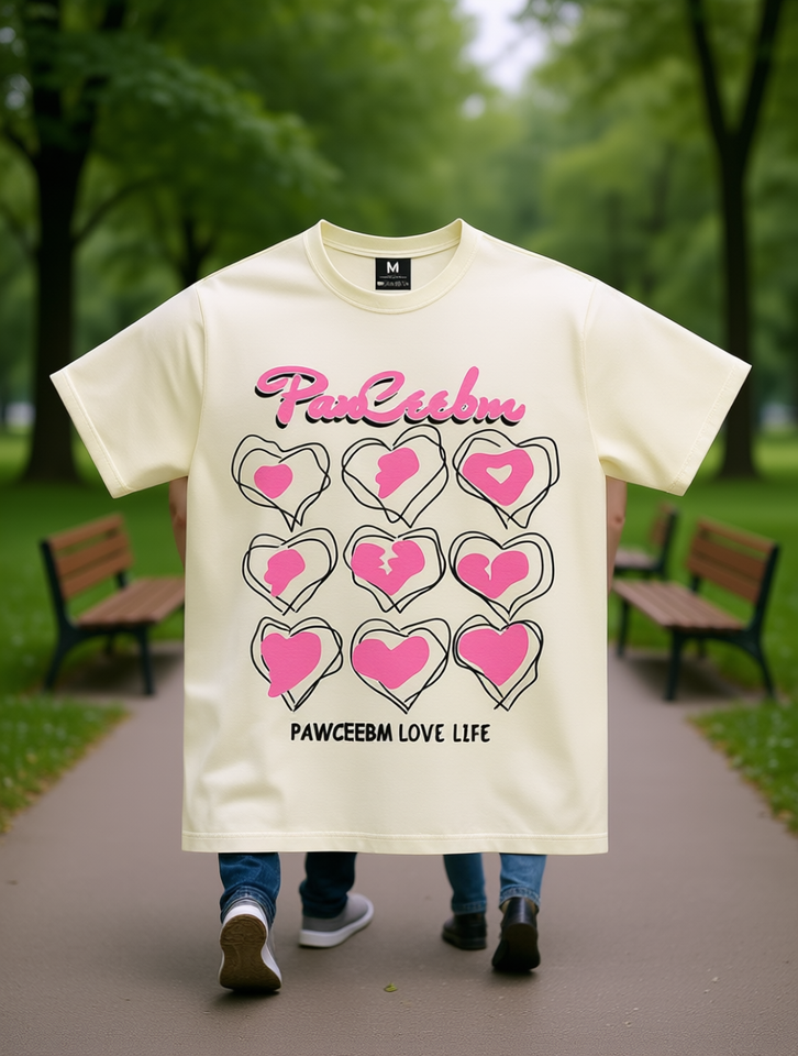 Pawcee Men's T-Shirt Loose Fit Casual Round Neck Geometric Heart Design Machine Washable Unisex Couple Outfit