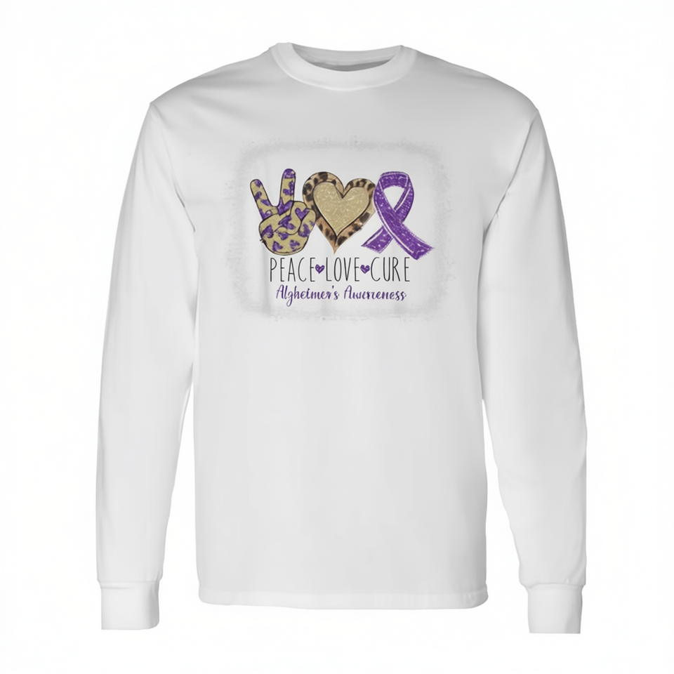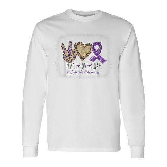 T-shirt a maniche lunghe Peace Love Cure Alzheimer's Awareness, design con nastro viola, girocollo unisex per adulti