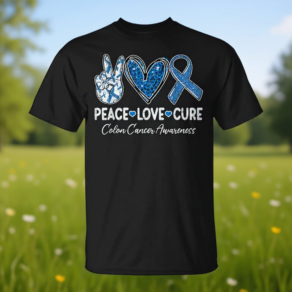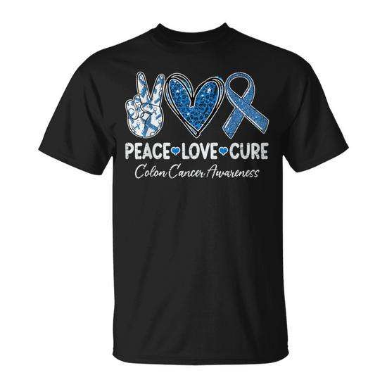 T-shirt promozionale di supporto per la sensibilizzazione sul cancro al colon e al colorectolo Peace Love Cure