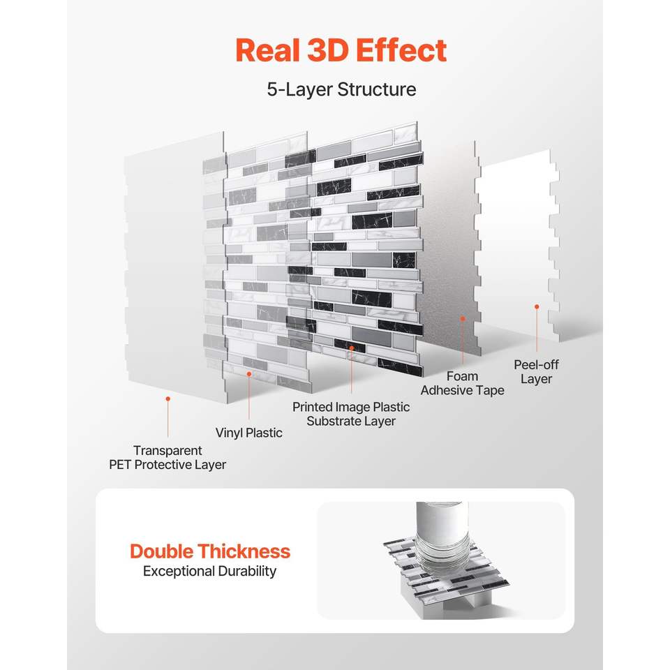 Piastrelle Adesive da Parete Peel-and-Stick, 10 Fogli, 305 x 305 x 2,0 mm, Stile Subway, per Paraschizzi
