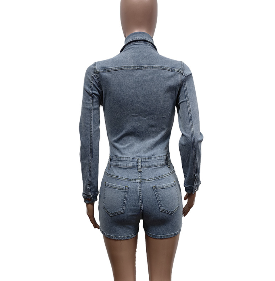 Peeqi F88538 Casual Elegant Streetwear Button Pocket Long Sleeve Jumpsuit Plus Size Clothing Sexy Denim Jeans Women