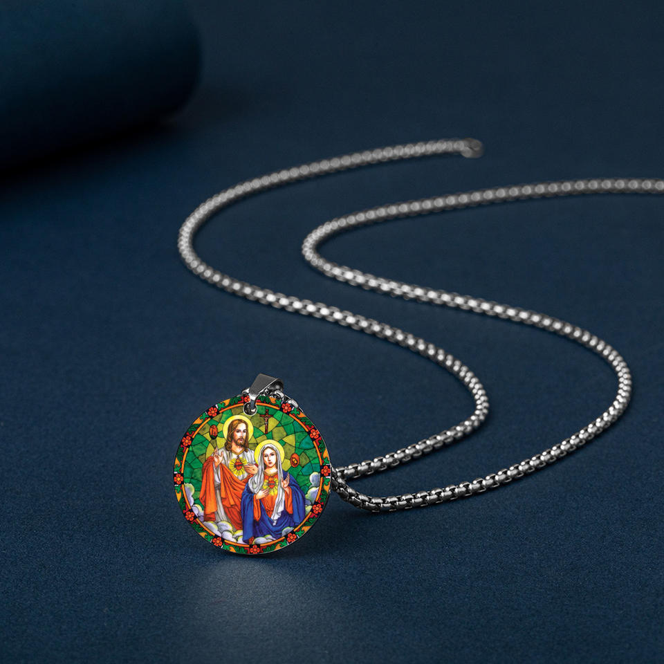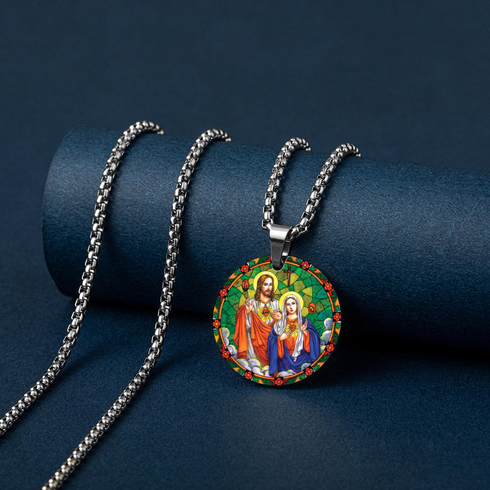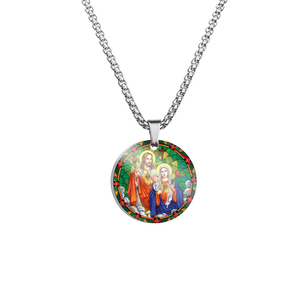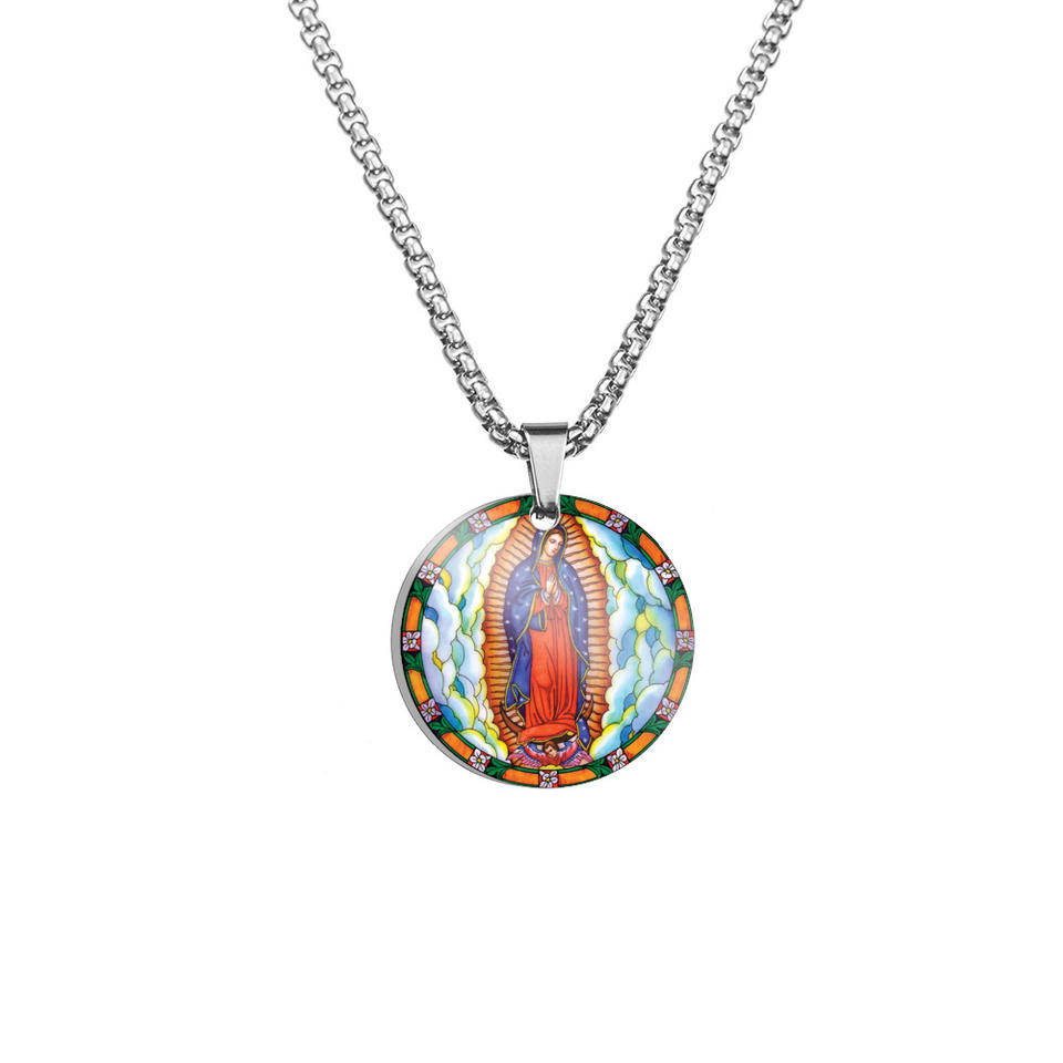 Pendants Heart of Jesus Virgin Mary Guadalupe 60 cm Chain Religious Silver Plated Colorful Catholic Stainless Steel Necklace