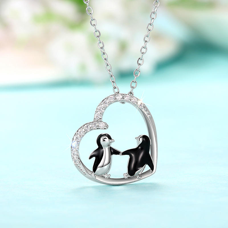 Ciondolo a Forma di Cuore Pinguino in Argento 925 Placcato Rodio con Cristalli e Strass, Charm Tematico con Incassatura a Castone, Regalo Unisex, Gioiello