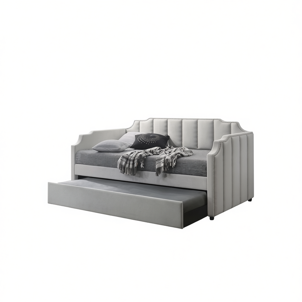Divano letto in velluto grigio tortora Peridot con letto estraibile singolo, elegante mobile per soggiorno