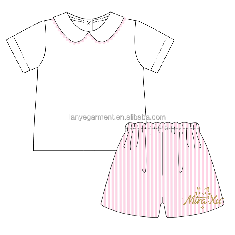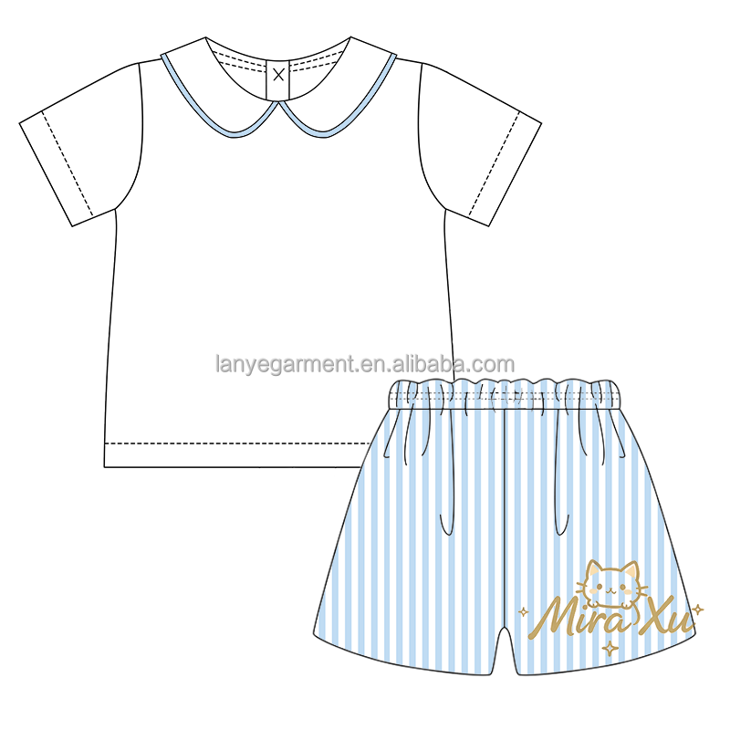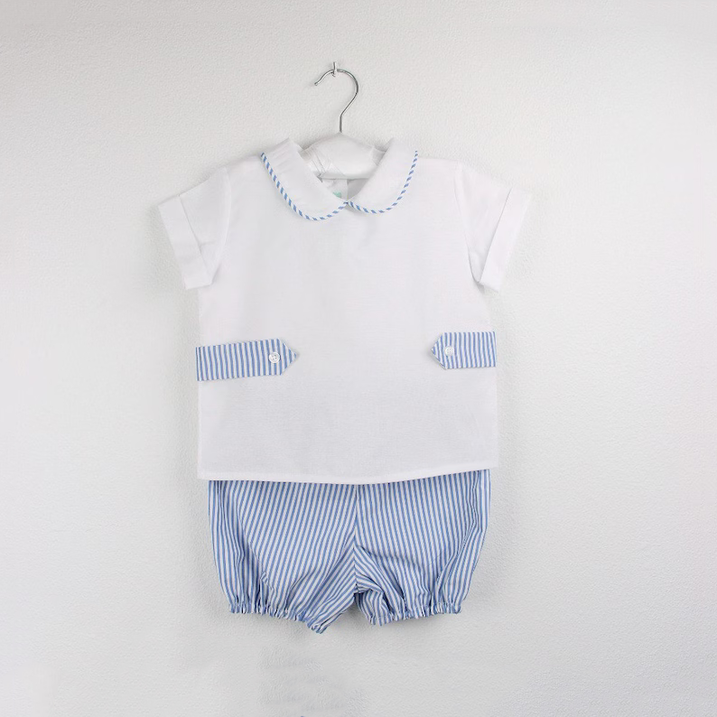 Set Estivo Personalizzabile per Neonati e Bambini: Camicia Bianca con Colletto e Pantaloncini a Righe Blu, Outfit Coordinato per Fratelli e Sorelle