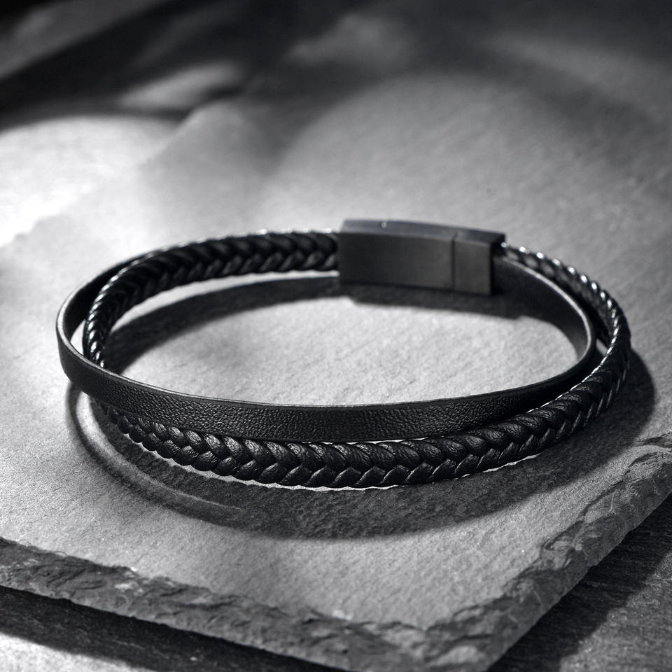 Bracciale in Pelle Nera Personalizzato per Uomo, Bracciale con Nome Personalizzato, Fascia in Pelle Intrecciata Piatta, Regalo per Lui