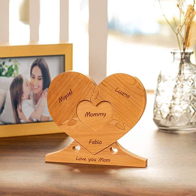 Personalized Cedar Folk Art Heart Puzzle Desk Decor Wood Block Plaque with 1-12 Name Engraved Wooden Table Signs