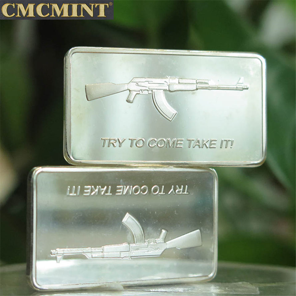 Personalized Custom Design Silver Plated Metal Crafts 100 Mills Silver Plated Try to Come Take It Ak47 Bar