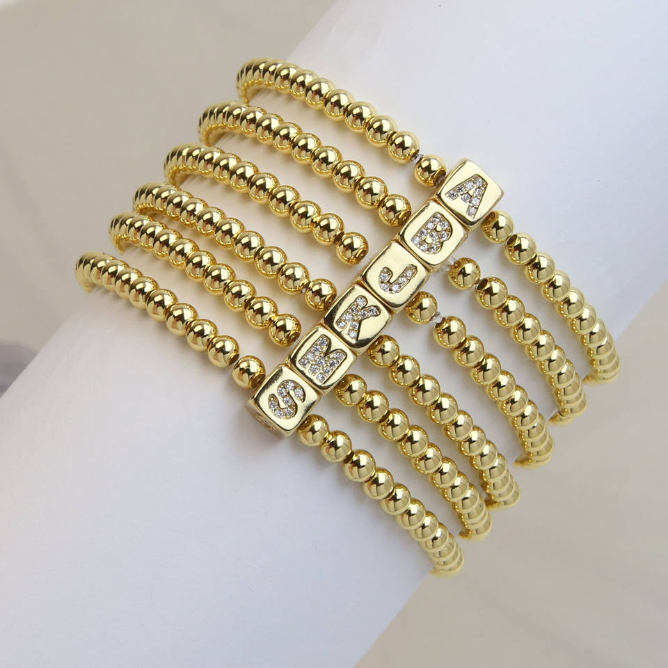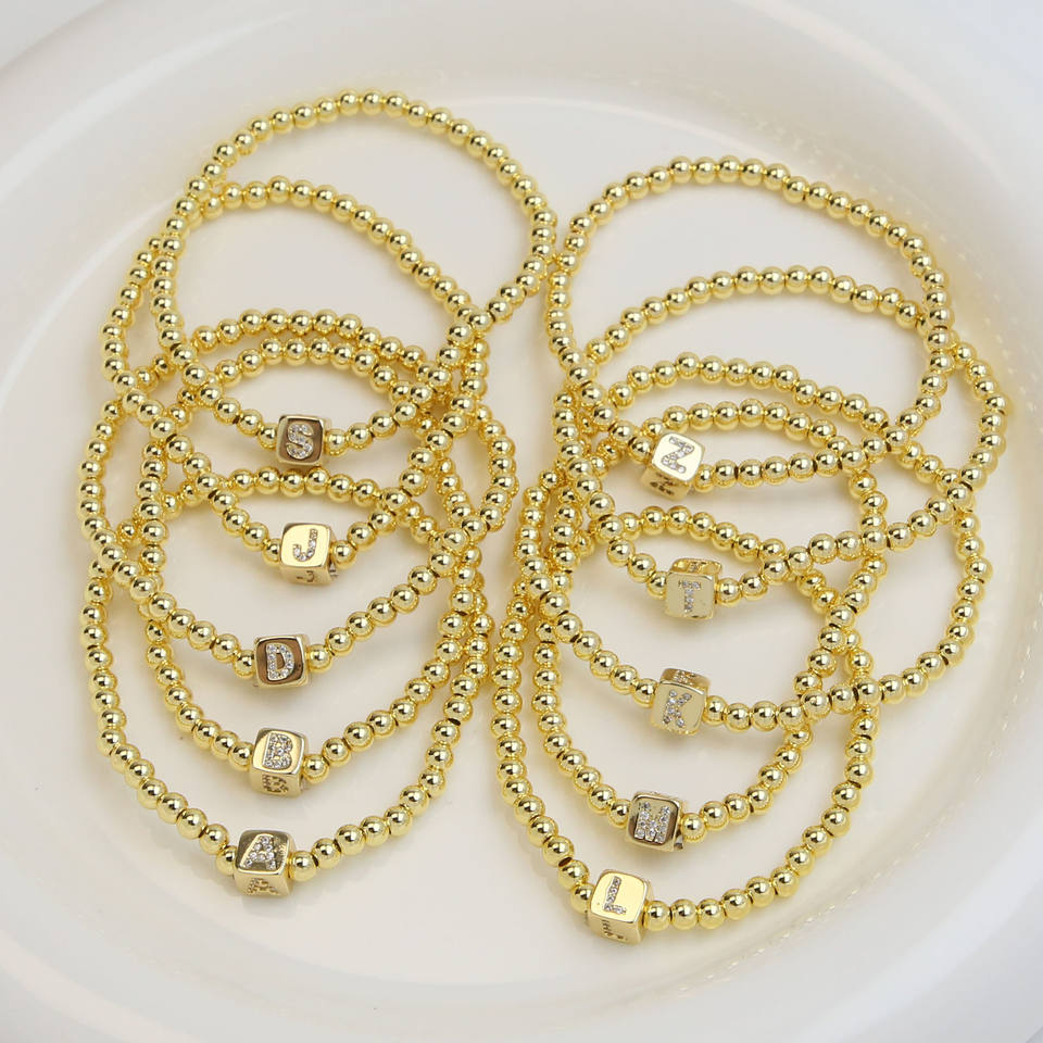 Braccialetto Personalizzato con Iniziale in Cubo Placcato Oro, Cristalli di Zirconio, 26 Lettere, Bracciale con Perline Quadrate