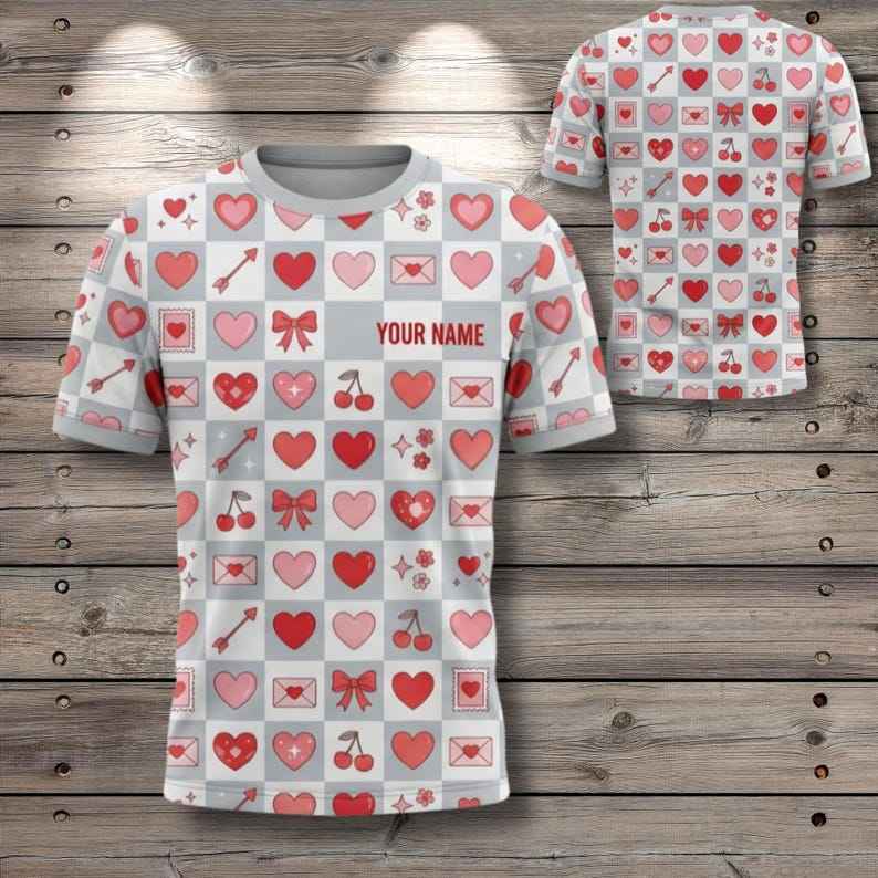 Maglietta Personalizzata Minimalista con Griglia e Cuore, Nome Personalizzato, Motivo EKG a Cuore, Regalo di San Valentino Unisex, Stampa Integrale