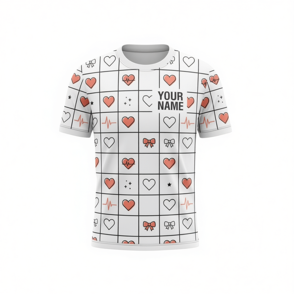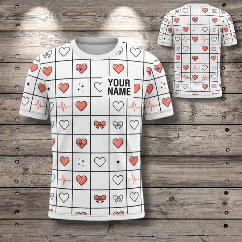 Maglietta Personalizzata Minimalista con Griglia e Cuore, Nome Personalizzato, Motivo EKG, Regalo di San Valentino Unisex, Stampa Integrale