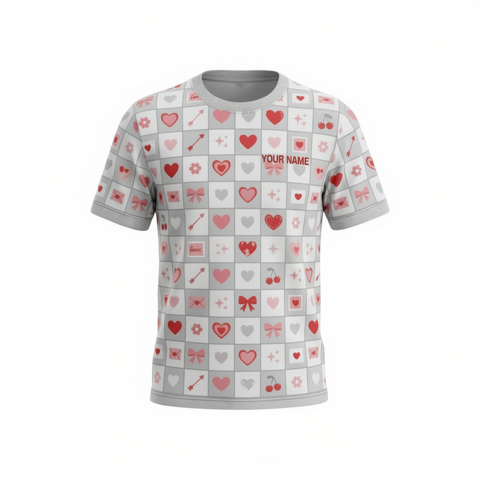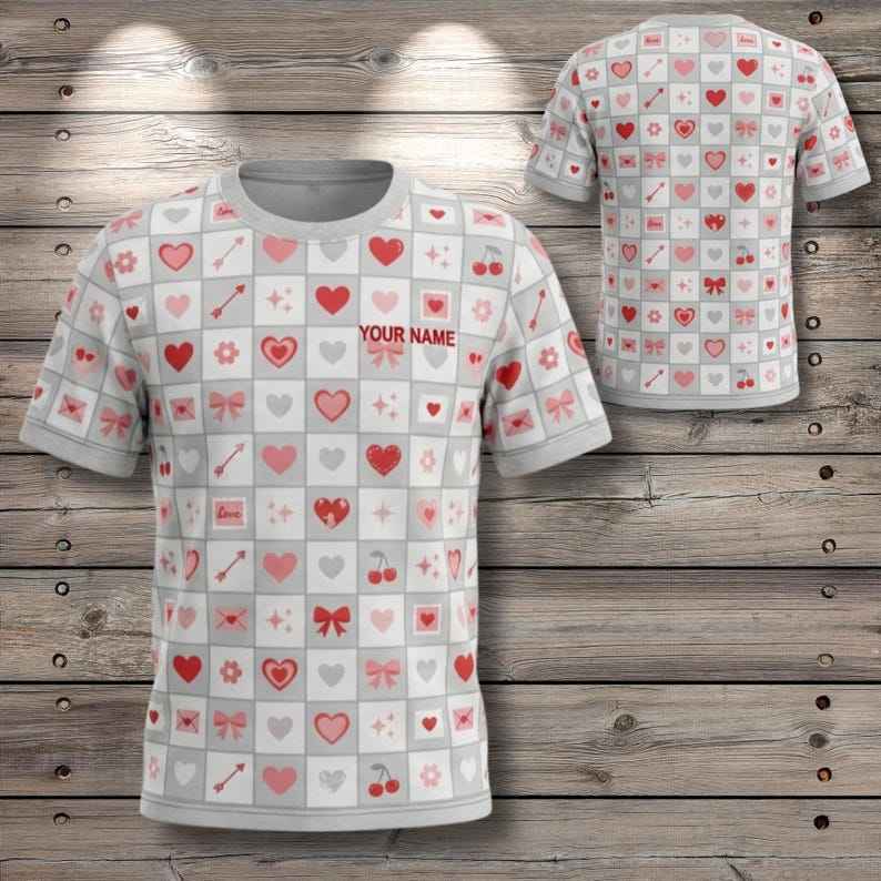 Maglietta Morbida Personalizzata con Motivo a Cuori e Griglia Minimalista, Nome Personalizzato, Regalo di San Valentino Unisex con Stampa Integrale