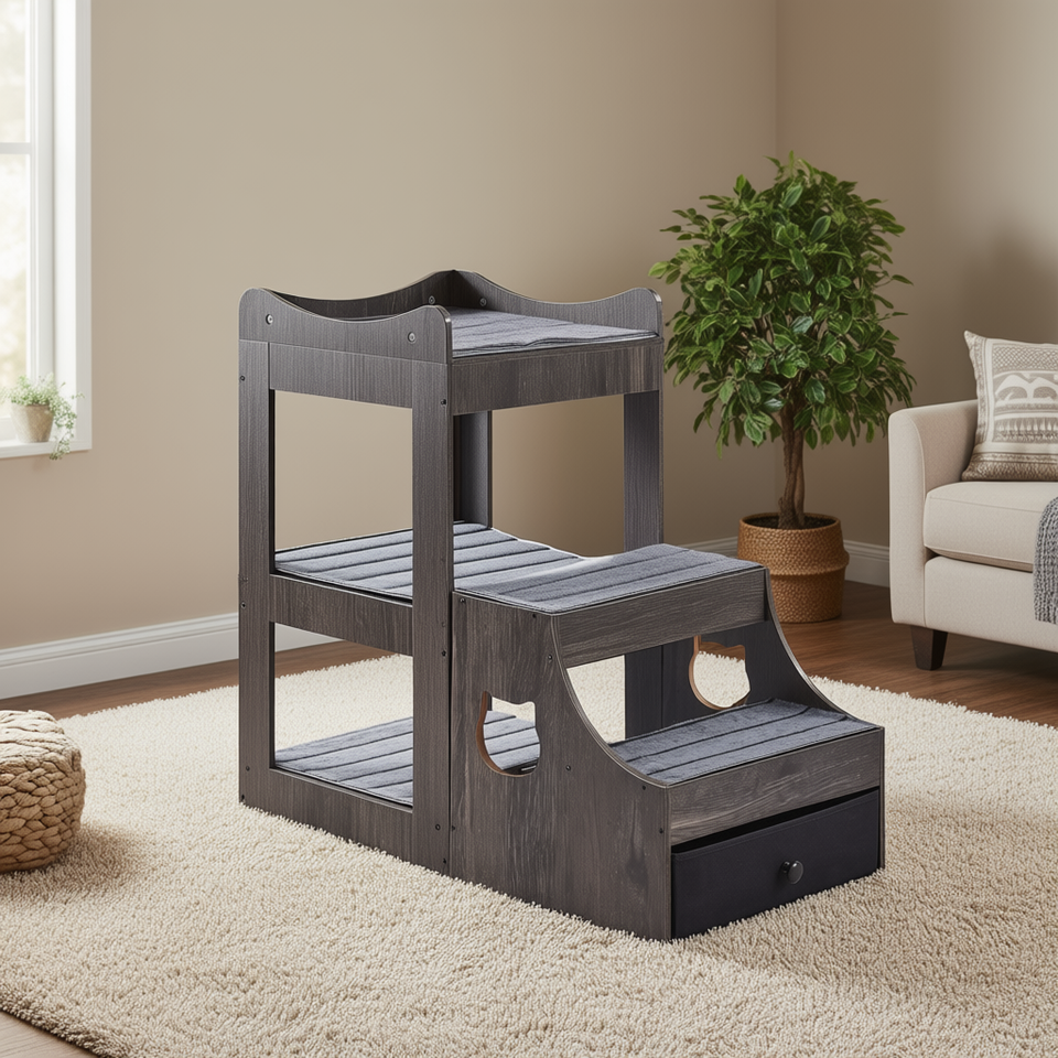 Letto a castello per animali domestici di piccole dimensioni, grigio, effetto legno, con contenitore, per interni, per cani e gatti, design moderno, forma rettangolare