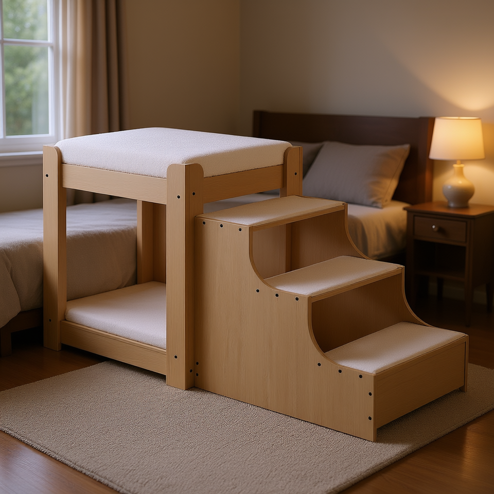 Letto a castello per animali domestici con scale, beige, piccolo, moderno, in legno, per cani e gatti, da usare accanto al letto