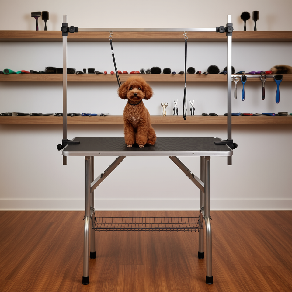 Tavolo da toelettatura per animali domestici, resistente, regolabile, in acciaio inossidabile, con braccio a noose e vassoio in rete, per cani di taglia grande