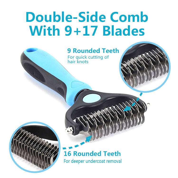 wholesale professional double sided reusable cleaning products hair remover pet grooming blue slicker comb brush Inner packaging blister card, outer packaging paper box.
